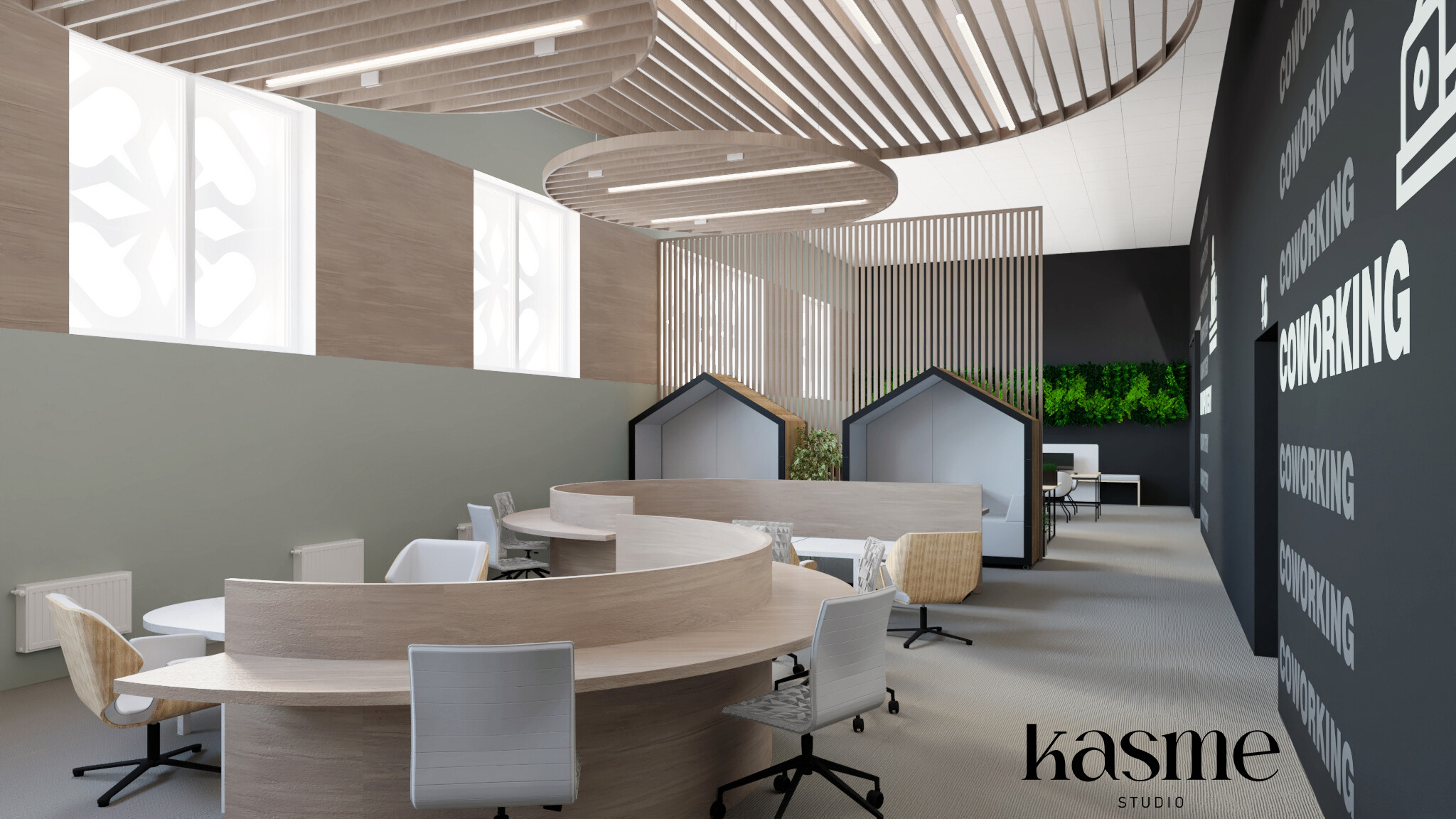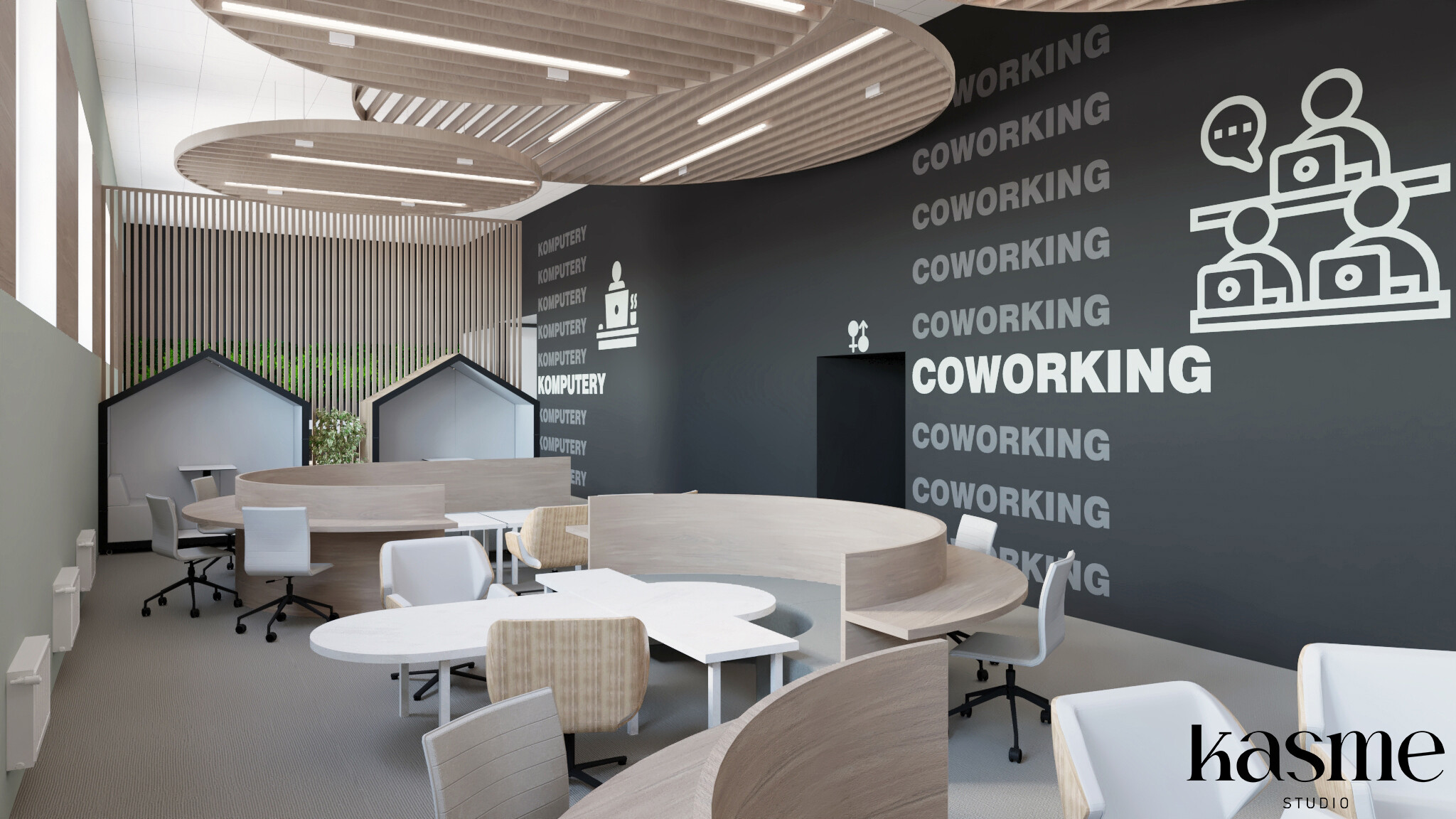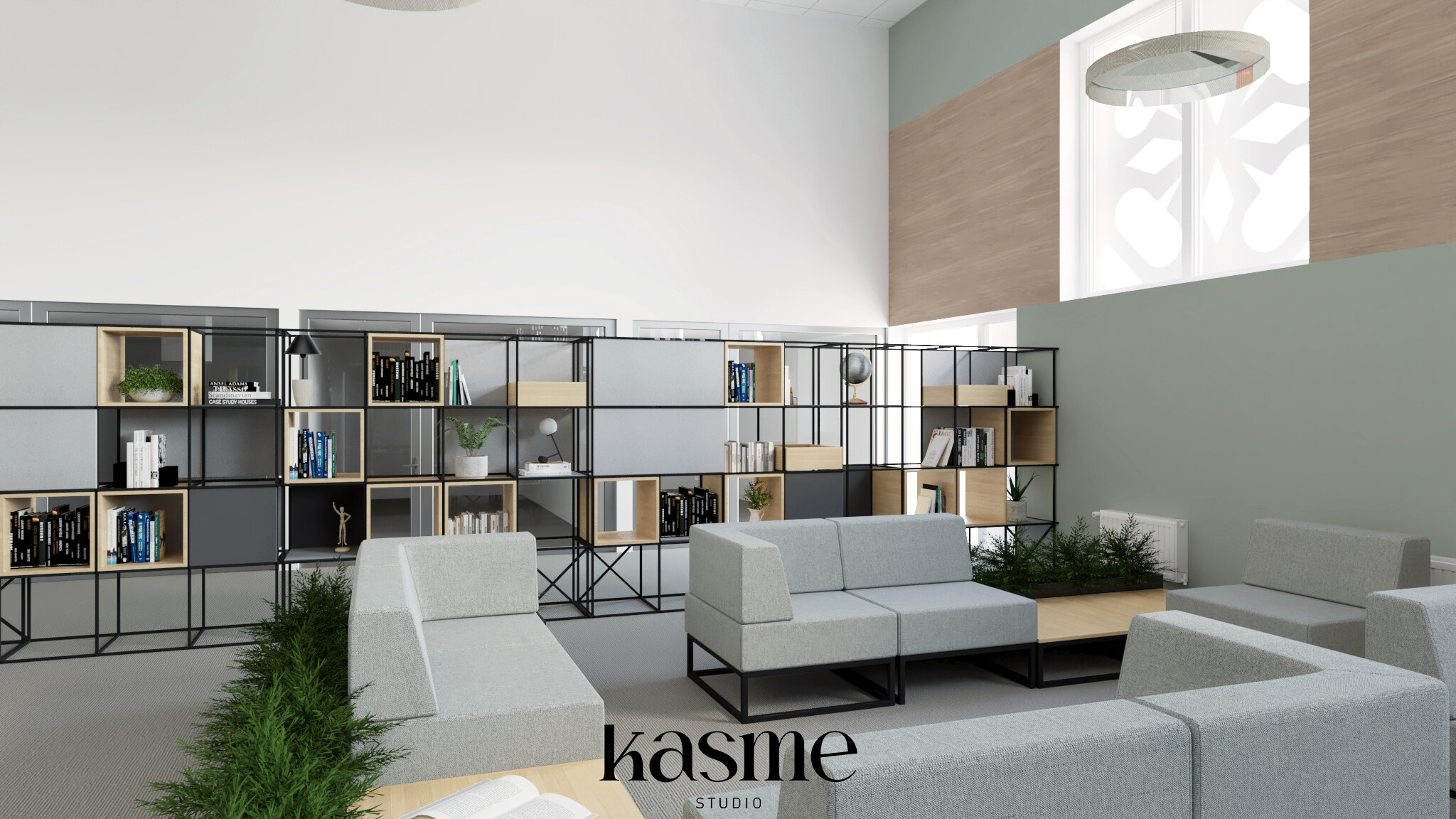 Celem było koncepcyjne zaprojektowanie strefy coworkingowej w Bibliotece Politechniki Białostockiej. Projekt zakładał podział danej przestrzeni na strefę do odpoczynku, strefę do pracy indywidualnej oraz w grupach, a także część przeznaczoną na stanowiska komputerowe. Poszczególne części oddzielone są od siebie dzięki zastosowaniu ażurowych ścianek, strefy te odznaczają się również różnym oświetleniem.