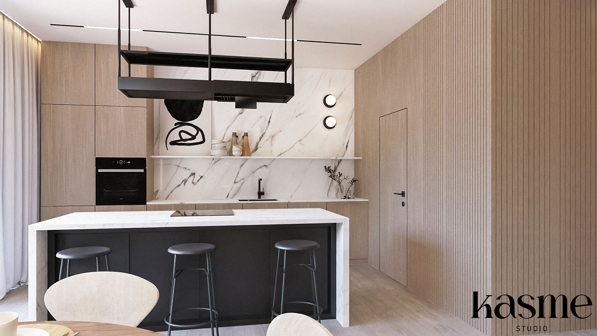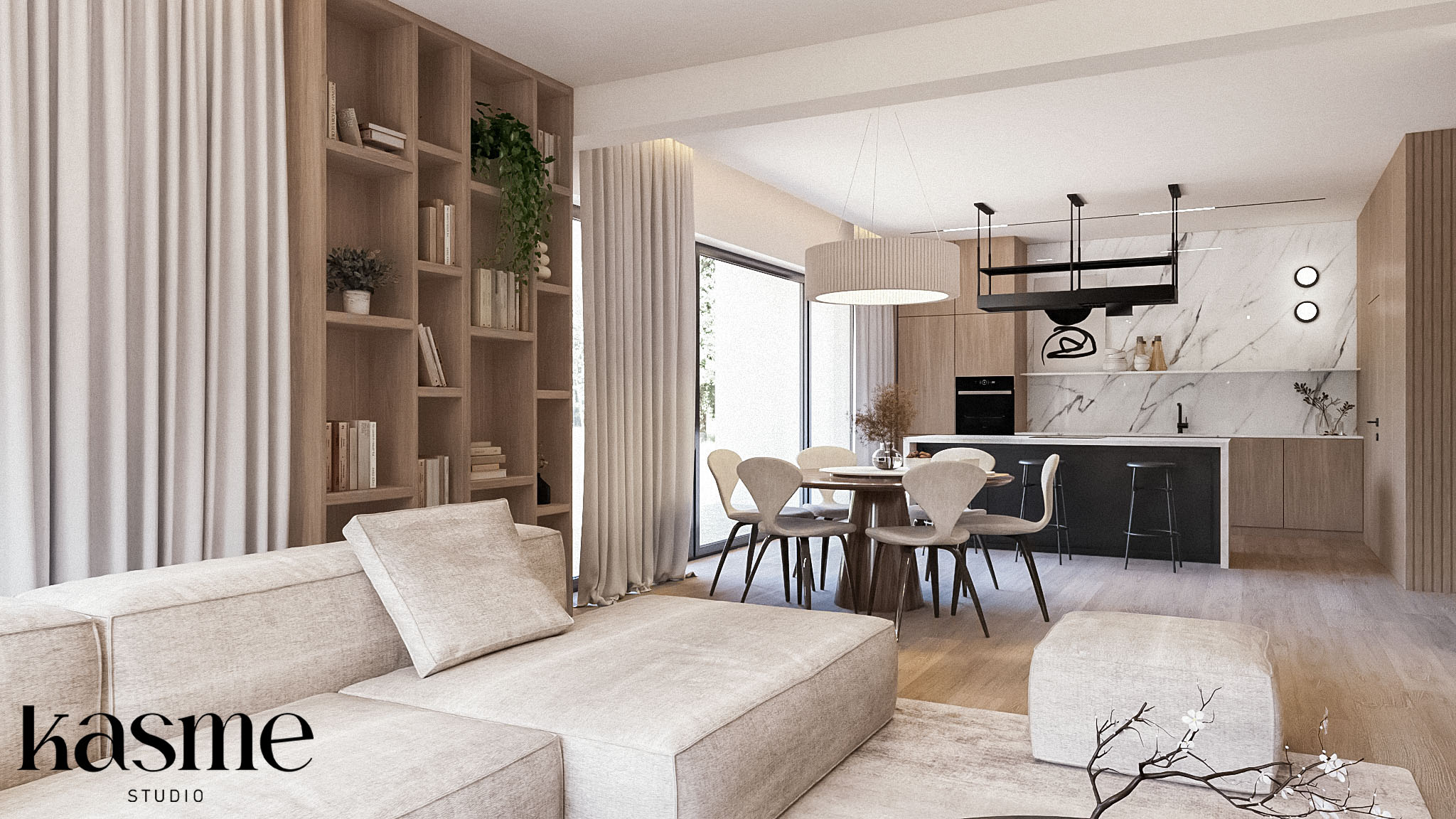 Projekt obejmuje strefę dzienną domu jednorodzinnego. We wnętrzu dominują jasne, ciepłe barwy oraz drewno i tkaniny w beżowych odcieniach.